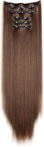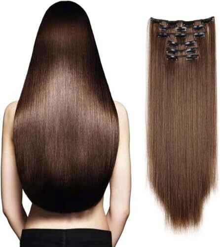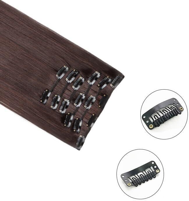 These clip in hair extensions add dramatic length with 24-inch, thick, silky straight strands. Six pieces with sixteen clips offer secure, easy application and natural blend with darkest brown. Perfect for adding length, volume, braids, updos, or ponytails, durable for long wear.