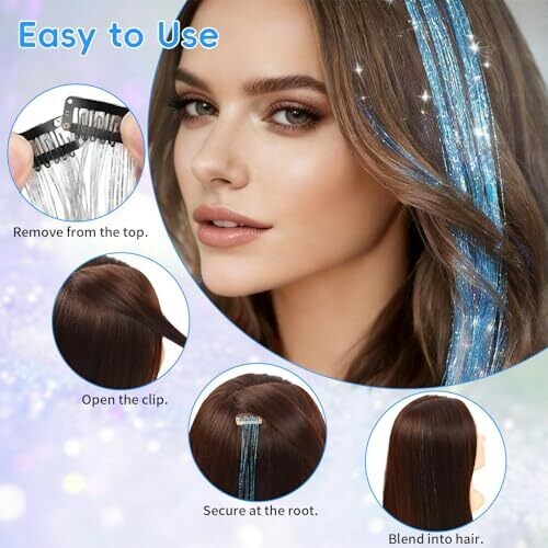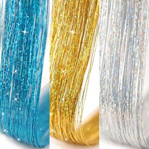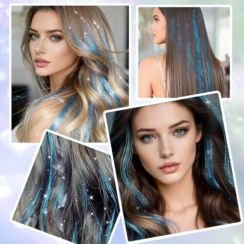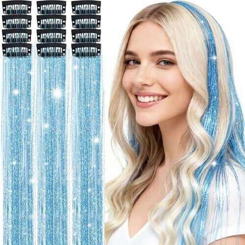• Vibrant Sky Blue 12-piece glitter tinsel set that instantly elevates any hairstyle with sparkling dimension.