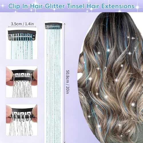 12-piece glitter tinsel set; strand length approximately 20 inches each; made from high-grade polyester fiber; clip-in, tool-free, damage-free application; lightweight and skin-friendly; reusable for multiple wears; suitable for women, teen girls, and kids; colors include sky blue and coordinating shades.