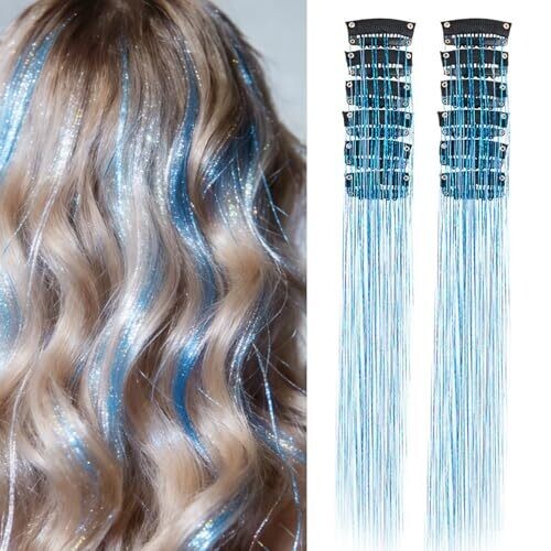 • Hzqzaoan 12 Clip In Glitter Tinsel Hair Extensions - Glitter 50cm Heat Resistant Clip In (Blue)