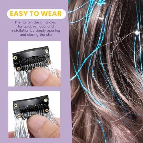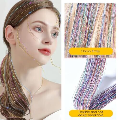 12-piece clip-in glitter tinsel hair additions with holographic shimmer strands.