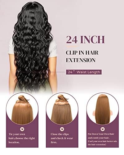 • Lonai 6pcs 24" Black Hair Extensions Long Mermaid Waves Wavy Synthetic Clip-On Hairpiece for Women (Black)
