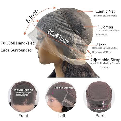 100% unprocessed Brazilian virgin hair, cut from a young donor; soft, natural, durable quality. 360 Hand Tied Full Lace Surrounding; parting space of 5 inches in front, 3 inches on the sides, 2 inches at the back. Cap