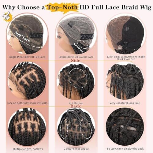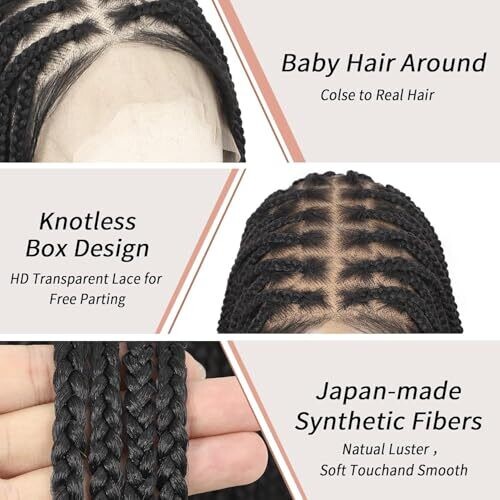 Premium synthetic braided wig with 360° full lace for natural fall and all-day comfort. Knotless box braids for lightweight wear, easy styling, and versatile updos. Pre-plucked baby hairs and seamless hairline for a confident, polished look. Black color.