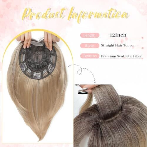 • Ms Taj 12 Inch Hair Topper for Women with Thinning Hair, featuring a 6.5" x 6.5" large base and bangs for natural coverage.