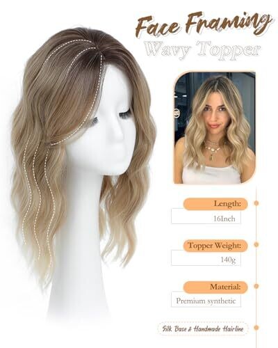 The product is a clip-in hair topper intended to increase hair volume. It features a 16-inch length with wavy curly brown-blonde hair and a dark root. Installation uses three anti-slip clips; no glue, sewing, or wig cap is required. The base includes a breathable silk cap with a small-area hand-knitted lace scalp portion for a more natural hairline. It is described as lightweight, natural-looking, and suitable for daily wear. It is not a full wig and is intended to add volume or conceal thinning hair; not recommended for severe hair loss. Color appearance may vary due to monitor and lighting conditions.