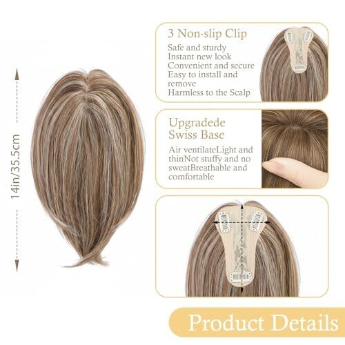 The product is a 14-inch hair topper designed for women, featuring a breathable Swiss base and lightweight construction. It uses three anti-clips to secure the topper in place and to maintain a natural look. The color is light brown & ash blonde, chosen to blend with common natural hair tones. The topper is made from synthetic hair and is intended for daily wear and for occasions, providing voluminous appearance and coverage for thinning, hair loss, or grey hair. It is described as durable and capable of withstanding regular use while maintaining appearance over time.