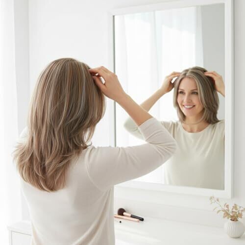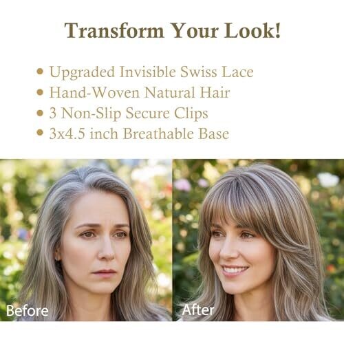 Instant volume with a natural blend that mirrors your hair for a seamless everyday look. Breathable Swiss base keeps your scalp cool, while lightweight clips secure the topper for all-day wear and discreet coverage of thinning, hair loss, or grey hair.