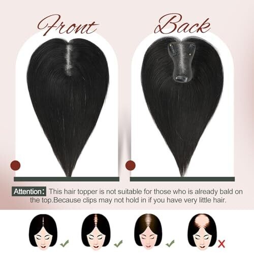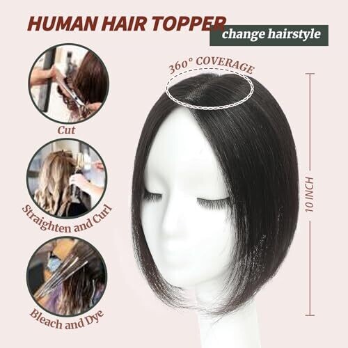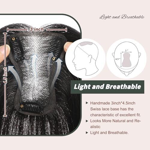 100% real human hair topper with 10 inch hair length. Base size 3 inch x 4.5 inch on a hand-tied Swiss lace cap. Features three anti-slip clips for secure attachment. Lightweight, breathable base designed to resemble strands growing from the scalp. Can be washed, straightened, and curled. Not suitable for someone who is nearly bald at the crown or who requires a thick cover.