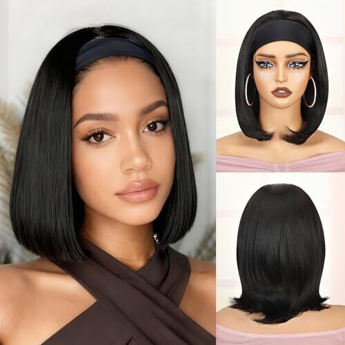 • Becus Black Headband Wig Black Straight, Lightweight Synthetic Hair Wigs for Women 10 Inch Half Wig Daily Wear (10''-Black)