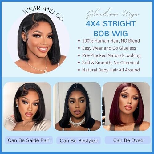This glueless 10-inch straight bob wig installs in seconds for easy wear. It features a 4x4 lace closure for natural parting, 100% Brazilian virgin human hair, pre-cut hairline, and a comfortable adjustable cap for a secure fit.