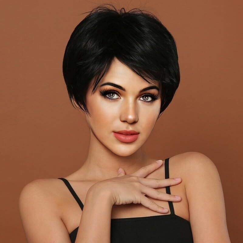 - Flattering short silhouette with soft bangs that frame your face beautifully.
