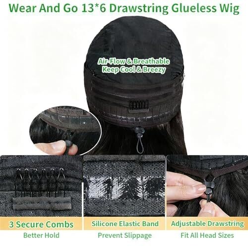 • Glueless cap design with adjustable straps and 3 combs ensures a snug, comfortable fit without slipping.