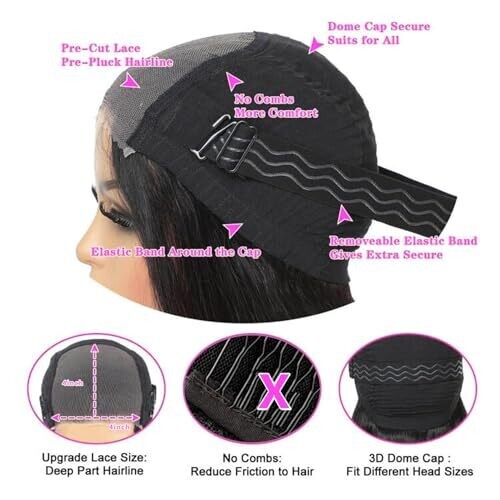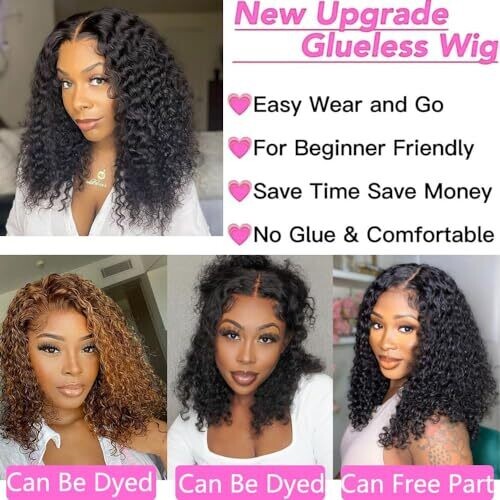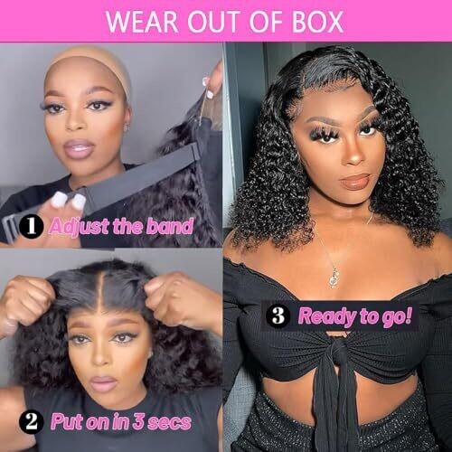 Experience a wear-and-go glueless wig with 100% human hair for a soft, natural look. It features a 4x4 lace closure with pre-plucked hairline, deep wave curly bob, medium cap with adjustable straps, and comes with eyelashes and wig caps for ready-to-wear.