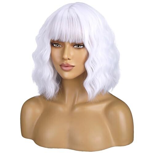 Beron 14 Inches White Wig with Bangs Short Curly Wig for Women Daily Party Hairnet Include