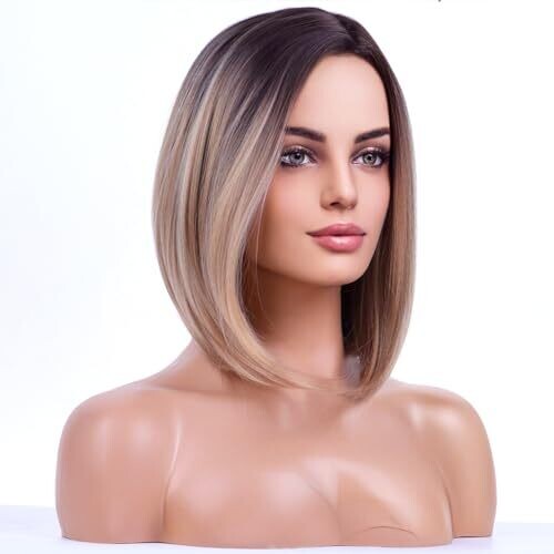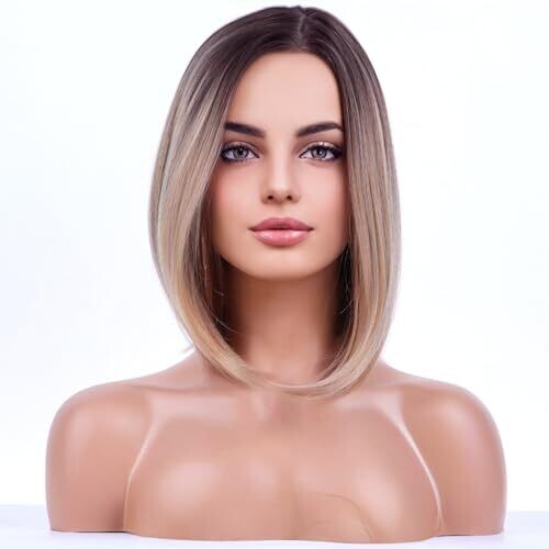 Transform a chic dark roots ombre into a flattering 15-inch short straight bob. Lightweight, breathable cap keeps you comfortable all day. Side part styling with no bangs offers versatile, face-framing looks. Includes wig cap for ready-to-wear convenience.