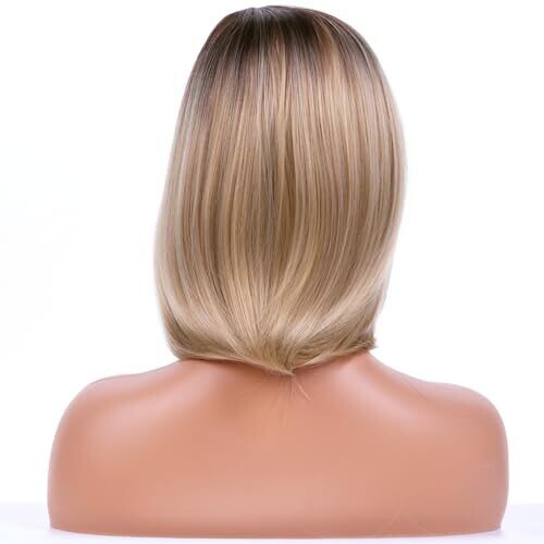 • Beron 15'' Short Straight Dark Roots Ombre Blonde Bob Wigs Side Part Wig Cap