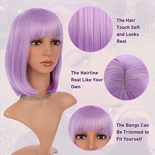 • eNilecor Short Bob Hair Wigs in 12" length with flat bangs delivers a natural, feminine look in a vibrant lavender purple for cosplay, daily wear, or parties.