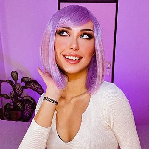 eNilecor short bob wig in 12 inches with flat bangs offers a natural look in lavender purple for cosplay, daily wear, or parties. Lightweight, soft synthetic fibers feel real, with breathable rose net and adjustable straps for comfortable fit.
