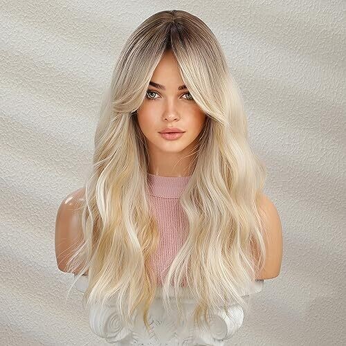 • Ombre Blonde Long Wavy Wig for Women 24 Inch Middle Part (Ombre Blonde)