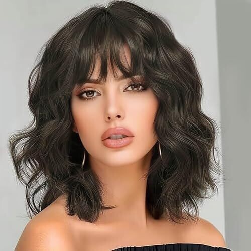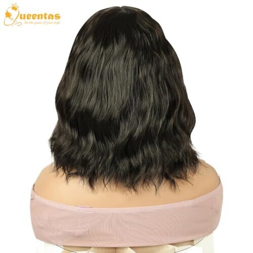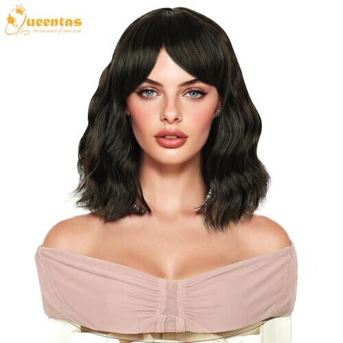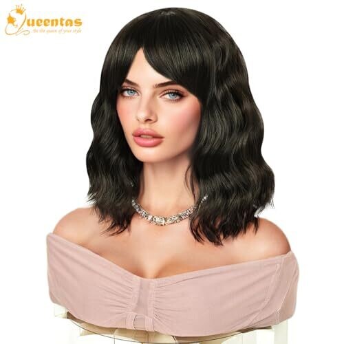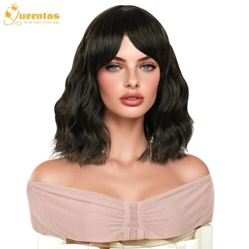 • Queentas Short Bob Black Brown Wigs for Women Wavy Wig Bangs Synthetic Hair