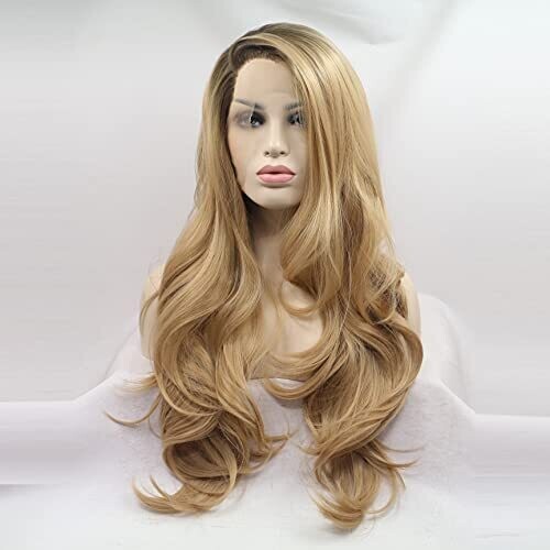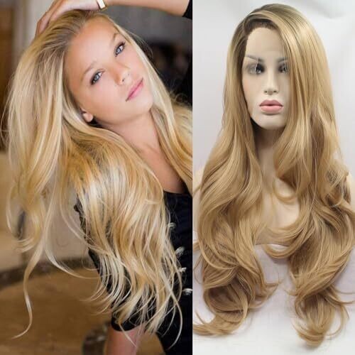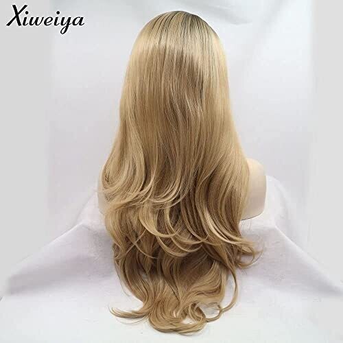 • Xiweiya Long Natural Wave Ombre Brown Blonde Synthetic Lace Front Wigs Side Part Heat Resistant Wigs