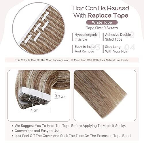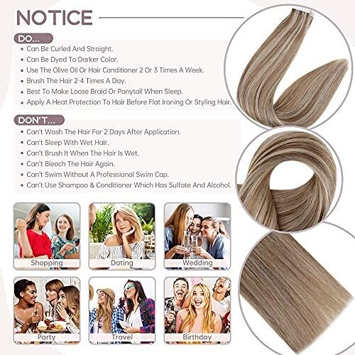 100% real human hair; tape-in extensions for easy application and removal. Care instructions: