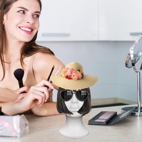 Lightweight foam mannequin head for showcasing wigs with a standard female head. Durable yet soft to touch, it retains shape for photos and store displays. Portable and versatile for hats, sunglasses, scarves, jewelry, and more in white finish.