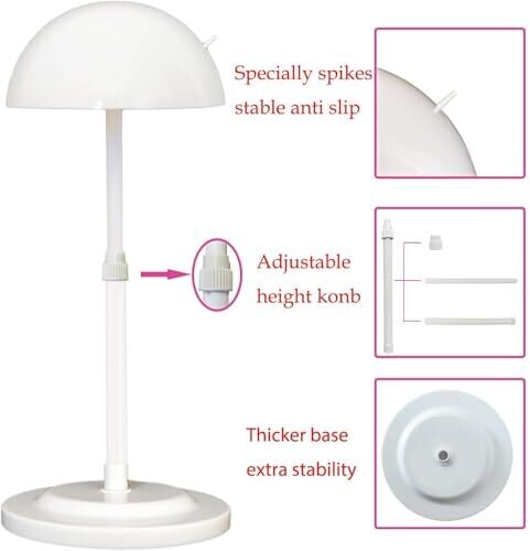 • Versatile solution for displaying, drying, or styling wigs and hats, compatible with a wide range of headgear.