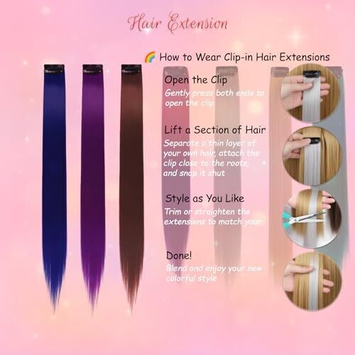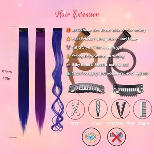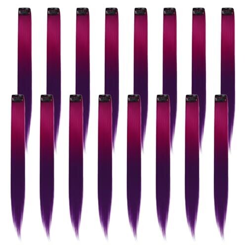 16pcs 22 Inch Clip-In Hair Extensions, Heat Resistant Synthetic, Rose PinktoPurple Highlights, Holiday Cosplay Gift