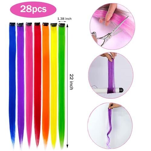 28 pcs Colored Hair Extensions, Clip-In Hair Extensions Rainbow Party Highlights Multi-Color for Cosplay Dress Up