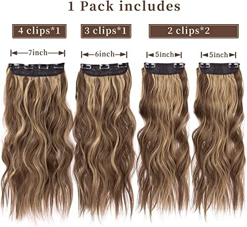 • 4pcs Clip in Hair Extensions Balayage Chocolate Brown to Caramel Blonde 20inch Long Wavy Synthetic Hair Extensions