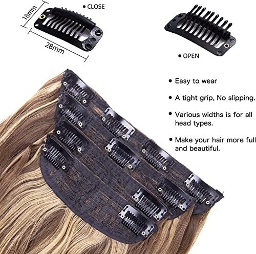 • Experience a seamless blend from Chocolate Brown to Caramel Blonde with 4pcs Clip in Hair Extensions for a luxurious balayage look.