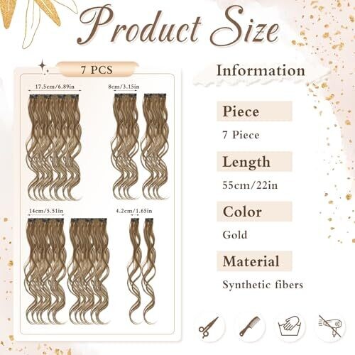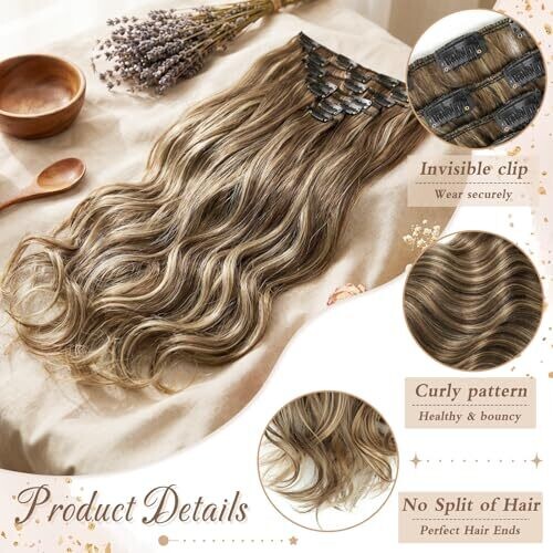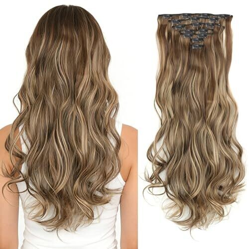Seven-piece clip-in curly hair extensions for women. 22-inch, wavy, thick hair with a double weft for added volume and length. Natural-looking, easy to apply, and comfortable for adults seeking fuller hair without long-term commitment.