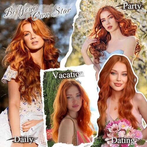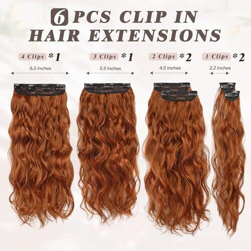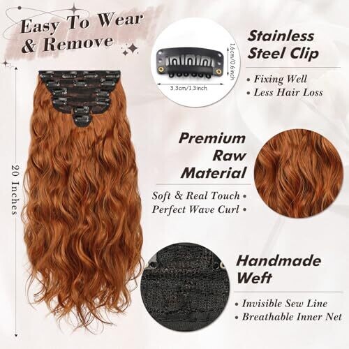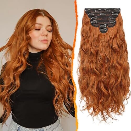 50 cm long wavy copper hair extensions in Ginger Copper for a natural, vivid look. Includes a 6-piece clip-in set for quick, full-head volume. Thick synthetic fibers blend with natural hair; stainless steel clips secure gently. Heat-styling allowed for versatility.