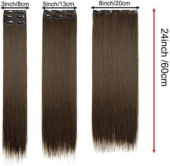 These clip in hair extensions add dramatic length with 24-inch, thick, silky straight strands. Six pieces with sixteen clips offer secure, easy application and natural blend with darkest brown. Perfect for adding length, volume, braids, updos, or ponytails, durable for long wear.