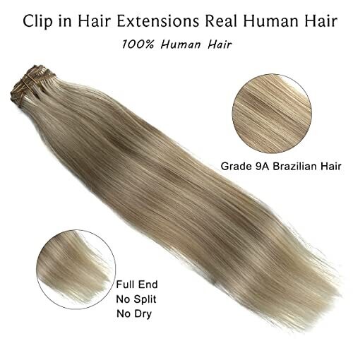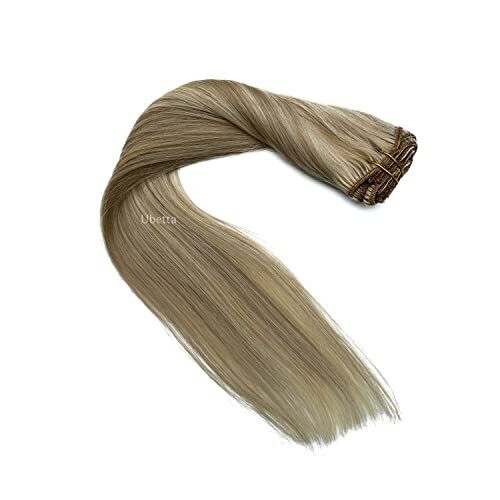 Transform your look with natural-looking clip-in extensions in dirty blonde balayage. 15-inch length adds volume and luminous highlights. Fast, damage-free application with secure stainless steel clips. Real human hair that can be washed, styled, curled, or straightened.