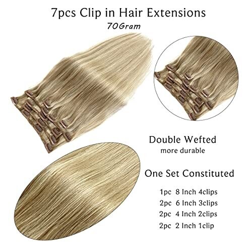 7 pieces, 70g total, double weft design, 16 clips.
