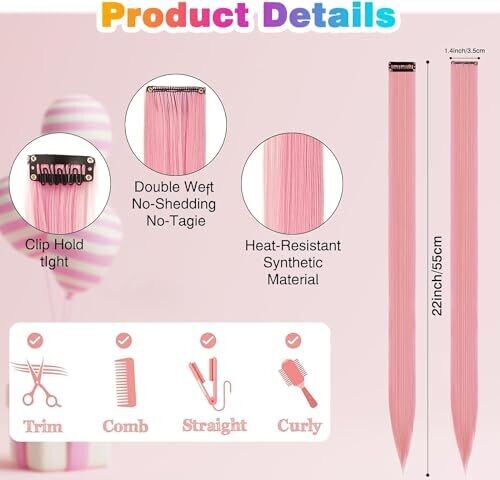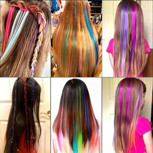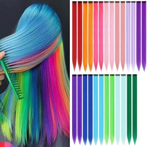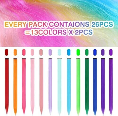 26Packs colored clip in hair extensions in 20-inch rainbow color blend, designed for kids and girls’ party looks. Clip-in with secure snaps for quick, mess-free attachment and removal; safe, low-odor synthetic fibers for everyday wear or celebrations.
