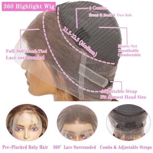 360 HD transparent lace front wigs human hair; pre-plucked, lightly bleached knots; natural-look hairline; wig can be parted in any direction and styled like own hair.