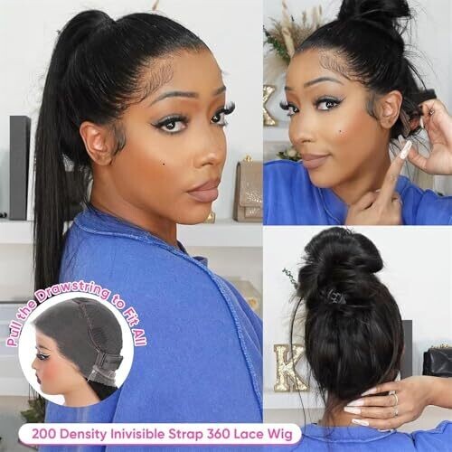 Experience a natural-looking, full silhouette with a seamless hairline. Premium human hair provides smooth texture and natural luster. 360 lace enables updos and ponies. Secure fit with hidden straps and elastic bands, pre-plucked hairline for ready styling.