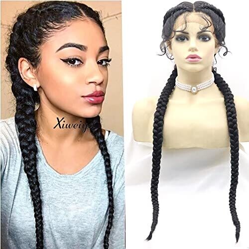 Luxurious Xiweiya 36 inch black braided wig features double twist braiding and a 360 full lace cap for natural movement. Soft heat-friendly synthetic fibers with a realistic hairline, comfortable cap, ideal for cosplay, Halloween, performances, and drag.
