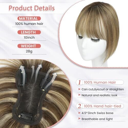 • Clip-in fringe topper with a hand-woven Swiss base designed for comfort, lightness, and lasting wear.