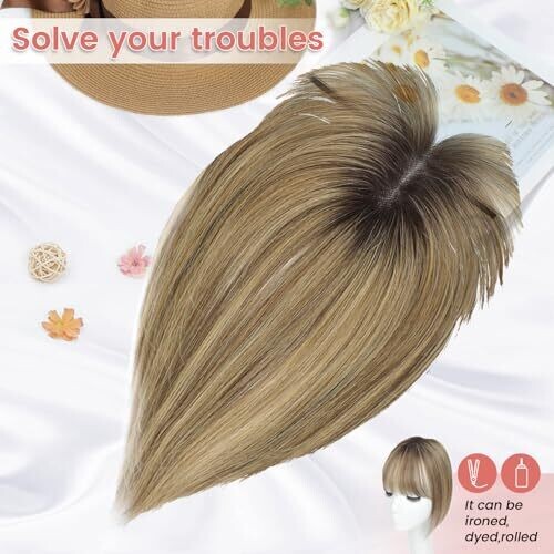 Hair Toppers for Women Fluffy Human Hair Topper 10Inch Handmade Swiss Base Hairpieces 360° Coverage Hairloss and Grey Hair (Ombre Light Brown with Blond Highlight)