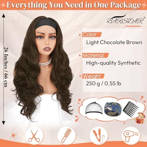• BARSDAR Light Brown Wavy Headband Wig, 66 cm long, designed for a natural, salon-ready look.