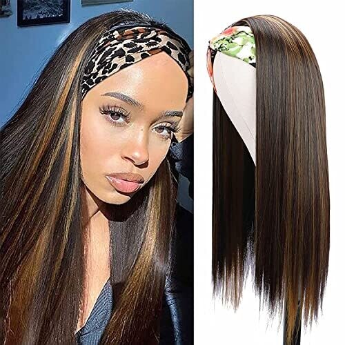 • Headband Wigs Straight 28 Inch Black Brown Glueless Highlights Long Headband Wig