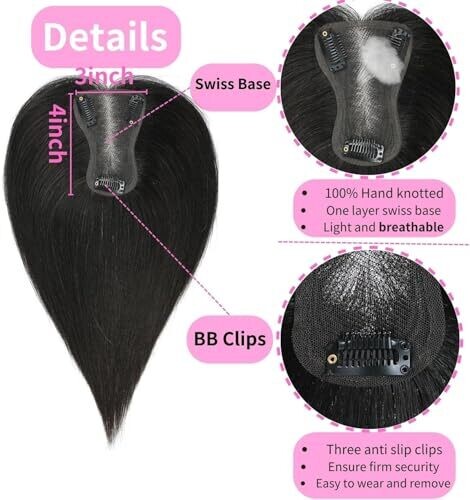 Restore fullness with a natural-looking hair topper designed for thinning hair. The 10-inch length blends seamlessly, features a breathable Swiss base, 120% density, and real human hair you can wash, curl, or color. Easy wear with three anti-slip clips for security.