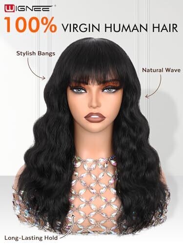 • Wignee 100% Virgin Human Hair Wave Wigs with Bangs Brazilian Black Color (16")