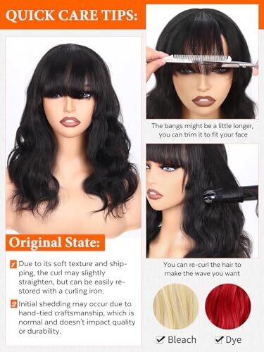 Premium 100% virgin human hair with a natural wave and bangs for a versatile, glam-ready look. Brazilian hair with soft texture and natural shine blends seamlessly. 16 inches with a comfortable, adjustable cap; easy maintenance and long-lasting wear.