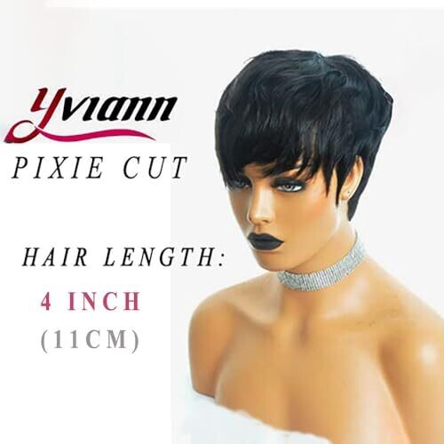 Yviann (1B Color) - Human Hair Pixie Cut Wigs with Bangs, Black Layered Wavy for Women 1B Colour
